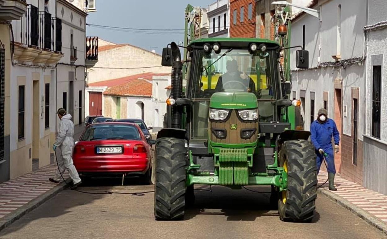 Los agricultores colaboran en la fumigación de calles para desinfectar contra el Coronavirus