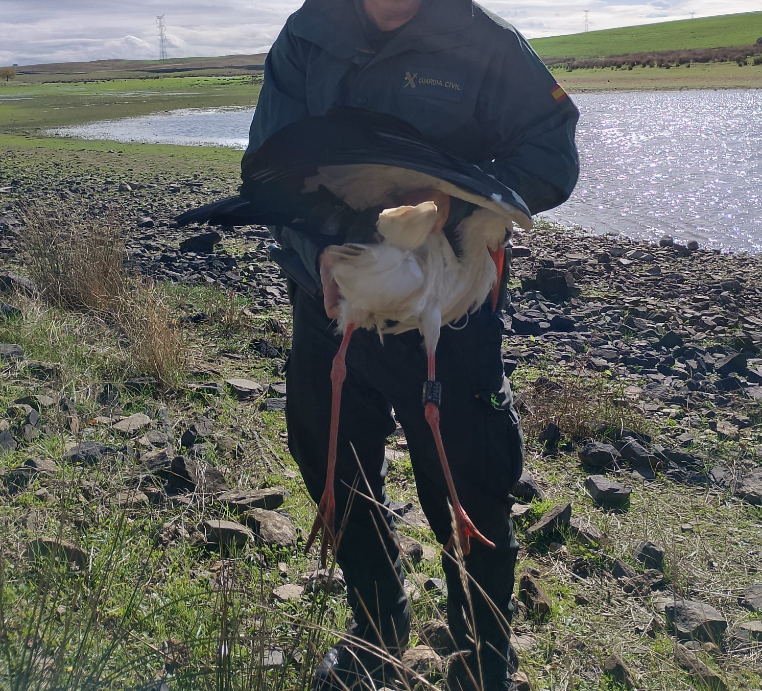 Efectivos de la Guardia Civil rescataron un ejemplar de cría de cigüeña que se encontraba en el suelo en la zona del Paredón, zona acuática situada en el término municipal de Campanario.