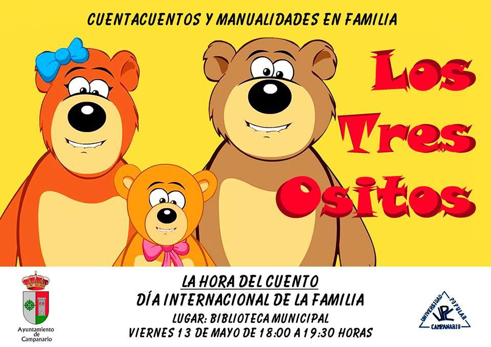 Este viernes 13 de mayo, con motivo del Día Internacional de la Familia, después de La hora del cuento, donde se trabajará con Los tres ositos, se realizarán actividades con los niños y sus padres.