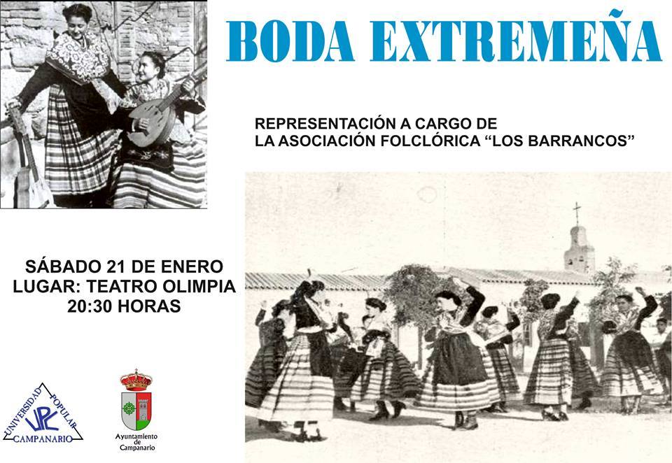 El Teatro Olimpia de Campanario acogerá este sábado una representación de una antigua boda extremeña, a cargo de la Asociación Folclórica Los Barrancos