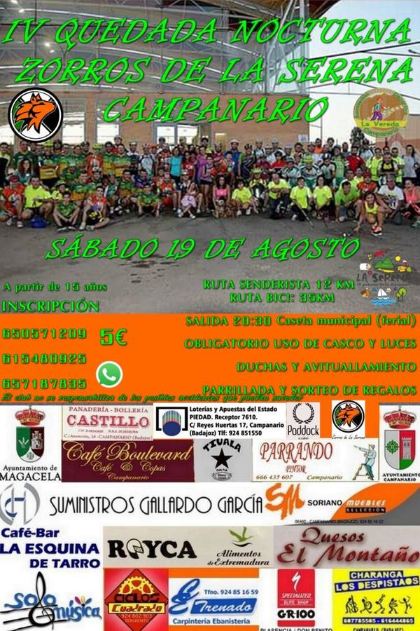 El próximo sábado 19 de agosto la asociación ciclista Zorros de la Serena celebrará su IV quedada ciclista, en la que estarán acompañados por la asociación senderista La Vereda. Ambos colectivos, en colaboración con el Ayuntamiento de Campanario, llevarán a cabo estas dos rutas nocturnas de convivencia.