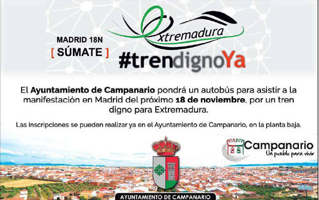 El Alcalde, Elías López, señalaba hace unos días: "La intención de esta alcaldía y su gobierno municipal es que ningún campanariense que esté interesado en asistir a Madrid con motivo de esta reivindicación histórica, se quede sin poder ir. Es de agradecer profundamente la respuesta que el pueblo de Campanario, como siempre, ha dado a esta iniciativa que demandamos todos y todas la extremeñas. El próximo 18 de noviembre, tenemos que alzar la voz de Extremadura en Madrid y reclamar lo que nos corresponde, que no es otra cosa que un tren digno ya".