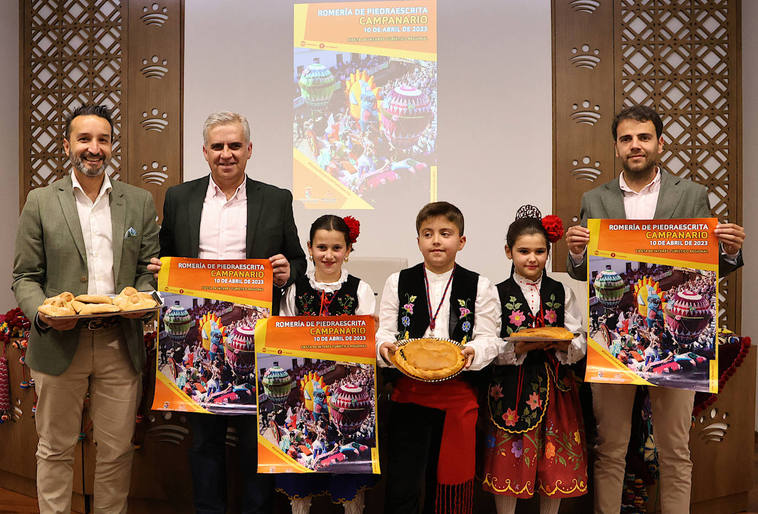 Los pequeños campanarienses Rocío, Alejandra y Manuel han posado para la prensa con los trajes folklóricos de la localidadLa Romería de Piedraescrita de Campanario, que se celebrará el próximo Lunes de Pascua 10 de abril, ha sido presentada esta mañana de forma oficial en la Diputación de Badajoz.